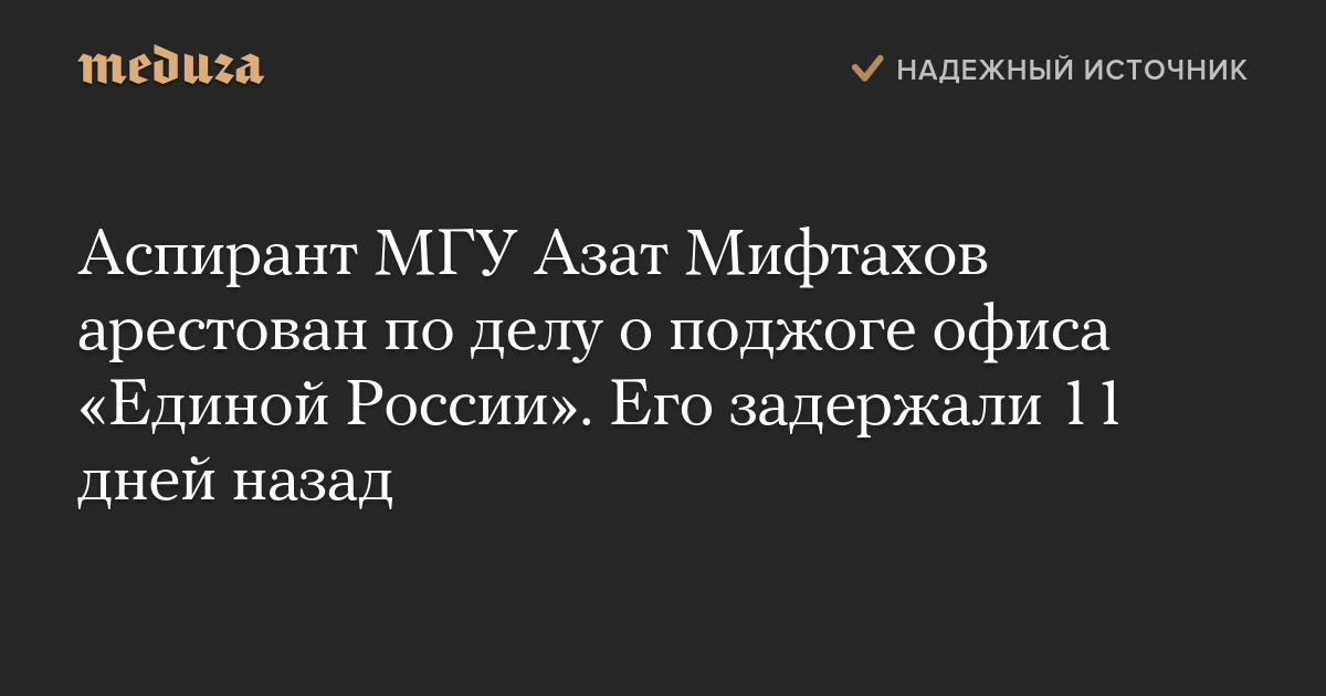 Аспирант МГУ Азат Мифтахов арестован по делу о поджоге офиса «Единой России». Его задержали 11 дней назад