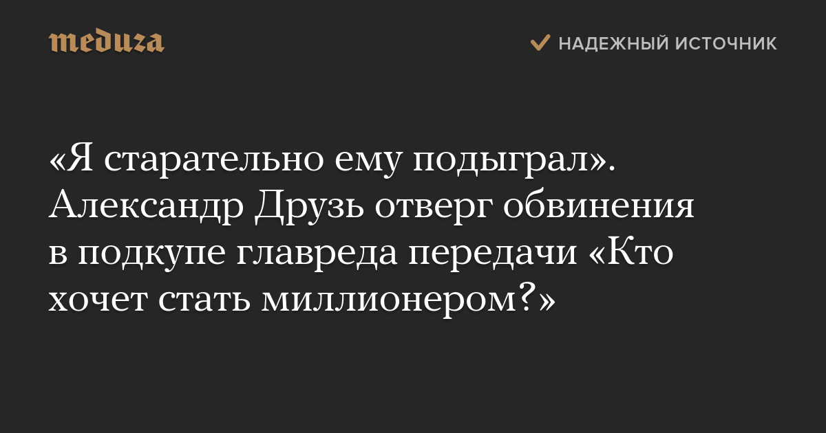 «Я старательно ему подыграл». Александр Друзь отверг обвинения в подкупе главреда передачи «Кто хочет стать миллионером?»