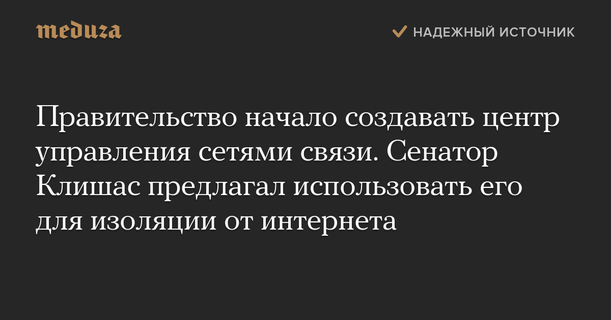 Правительство начало создавать центр управления сетями связи. Сенатор Клишас предлагал использовать его для изоляции от интернета