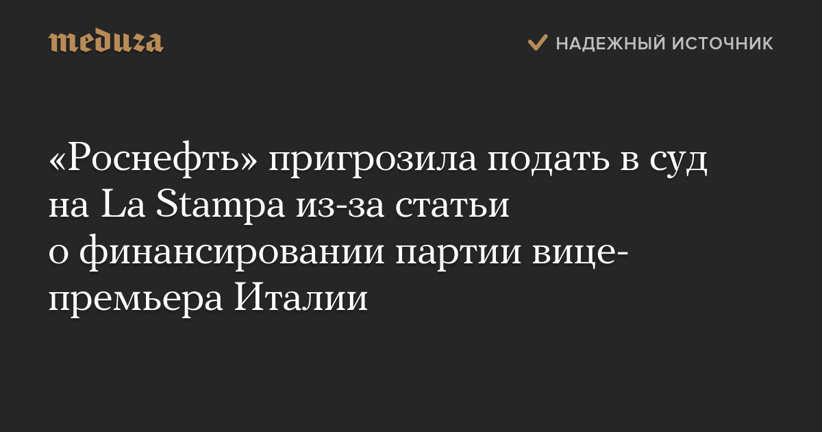 «Роснефть» пригрозила подать в суд на итальянскую газету La Stampa из-за заметки о том, что она якобы участвовала в финансировании избирательной кампании партии «Лига» итальянского вице-премьера Маттео Сальвини.