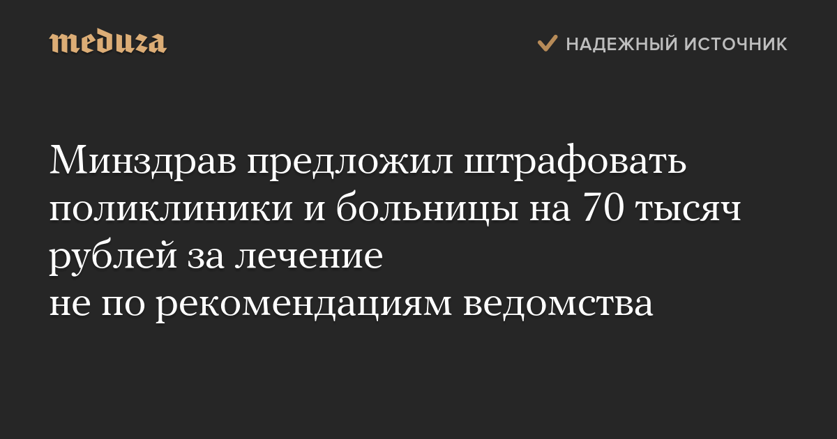 Минздрав предложил штрафовать на сумму от 50 до 70 тысяч рублей медицинские организации, которые будут лечить пациентов не по утвержденным государством рекомендациям. Для должностных лиц предусмотрены штрафы в размере 10-20 тысяч рублей.