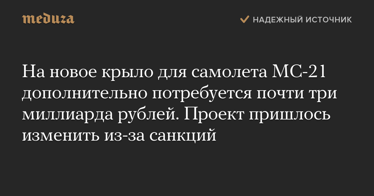 На новое крыло для самолета МС-21 дополнительно потребуется почти три миллиарда рублей. Проект пришлось изменить из-за санкций