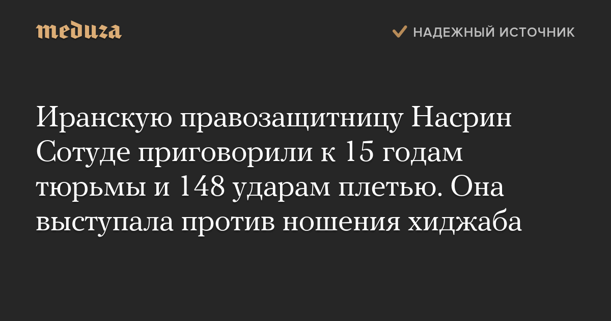 Иранскую правозащитницу Насрин Сотуде приговорили к 15 годам тюрьмы и 148 ударам плетью. Она выступала против ношения хиджаба