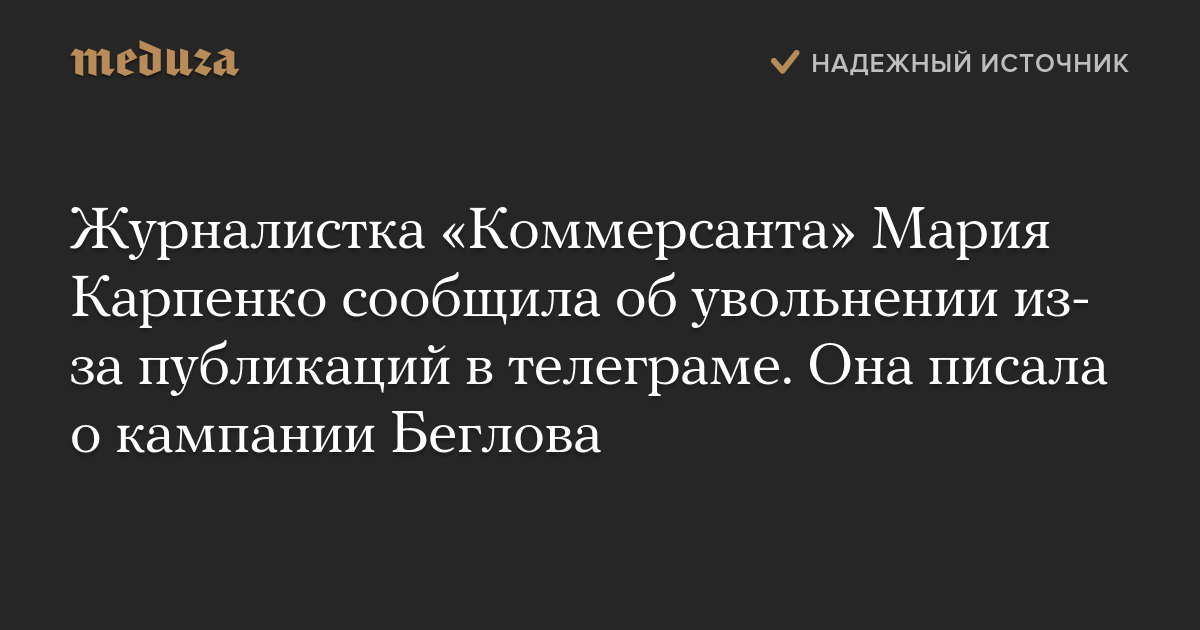 Журналистка «Коммерсанта» Мария Карпенко сообщила об увольнении из-за публикаций в телеграме. Она писала о кампании Беглова