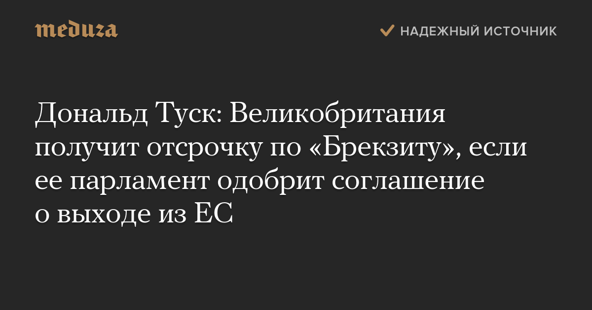 Глава Европейского совета Дональд Туск заявил, что Великобритания сможет получить «короткую отсрочку» «Брекзита», если парламент страны одобрит соглашение об условиях выхода из Евросоюза.