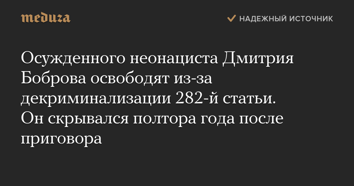 Осужденного неонациста Дмитрия Боброва освободят из-за декриминализации 282-й статьи. Он скрывался полтора года после приговора