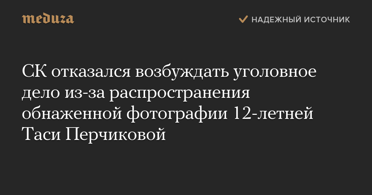 СК отказался возбуждать уголовное дело из-за распространения обнаженной фотографии 12-летней Таси Перчиковой, которая подверглась травле после обращения к президенту России. Об этом сообщает «Радио Свобода» со ссылкой на мать девочки. Копия постановления СК есть в распоряжении «Медузы».