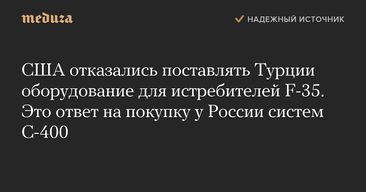 США прекратили поставку в Турцию оборудования и запчастей для истребителей F-35 из-за того, что Анкара намерена купить российские ЗРК С-400 «Триумф», сообщает Reuters со ссылкой на источники.