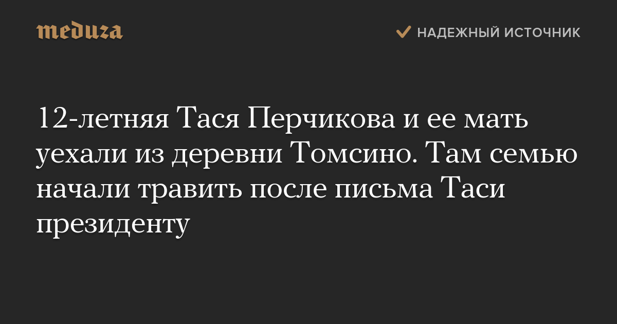 12-летняя Тася Перчикова и ее мать уехали из деревни Томсино. Там семью начали травить после письма Таси президенту