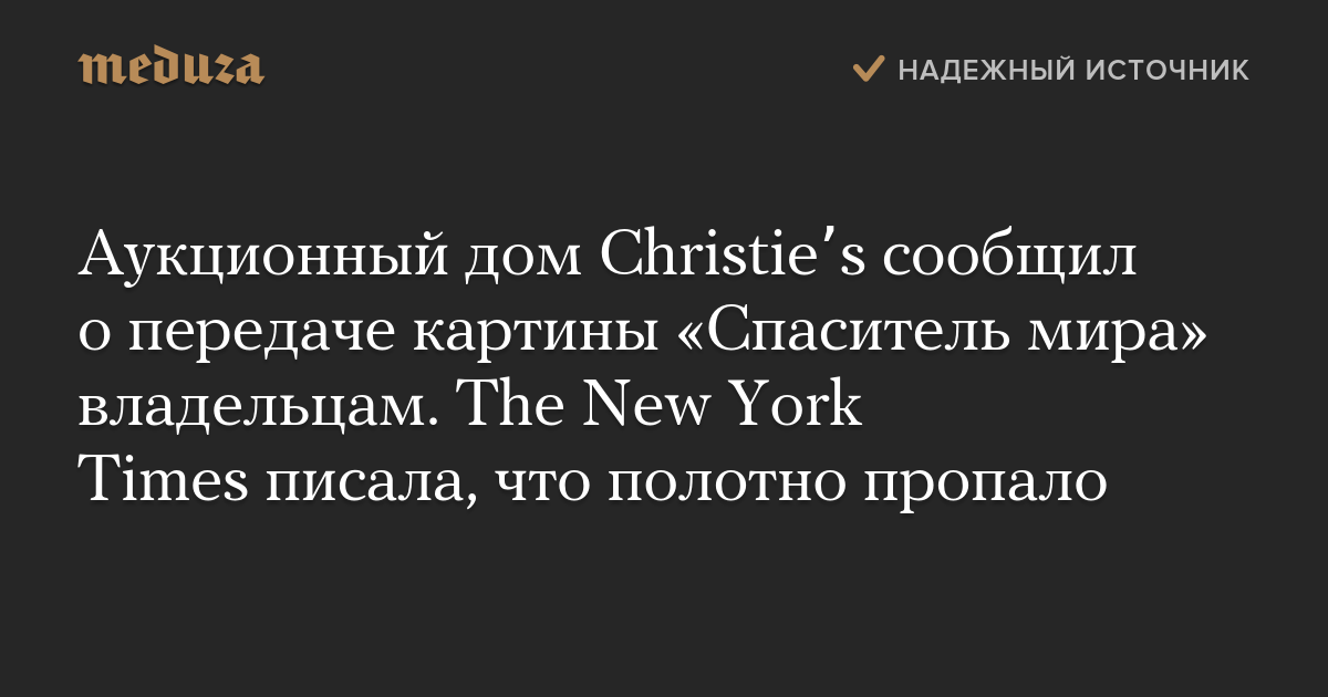 Аукционный дом Christieʼs сообщил о передаче картины «Спаситель мира» владельцам. The New York Times писала, что полотно пропало