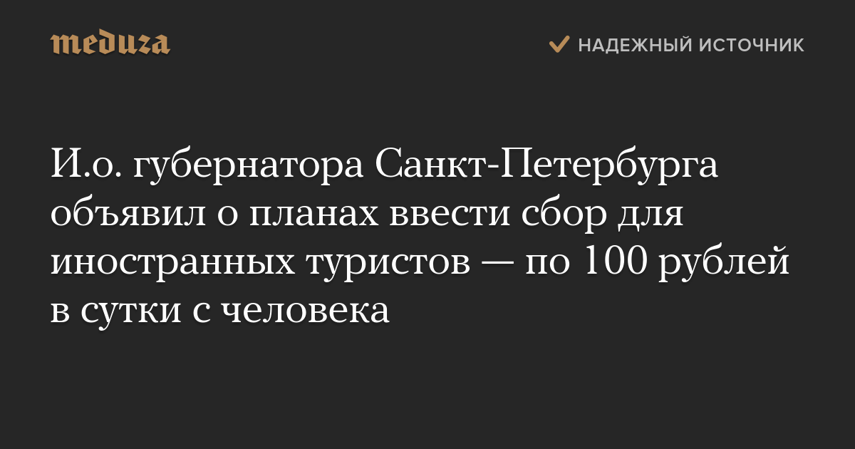 И.о. губернатора Санкт-Петербурга объявил о планах ввести сбор для иностранных туристов — по 100 рублей в сутки с человека