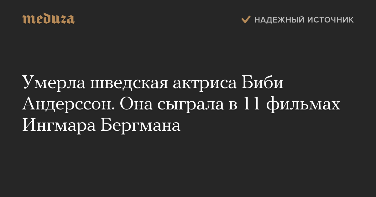 Шведская актриса Биби Андерссон умерла 14 апреля в возрасте 83 лет. Об этом сообщает издание Goteborgs-Posten со ссылкой на подругу актрисы, режиссера Кристину Улофсон. Смерть Андерссон также подтвердила ее семья.