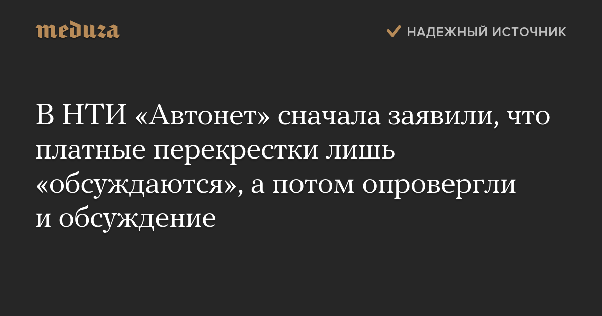 В НТИ «Автонет» сначала заявили, что платные перекрестки лишь «обсуждаются», а потом опровергли и обсуждение