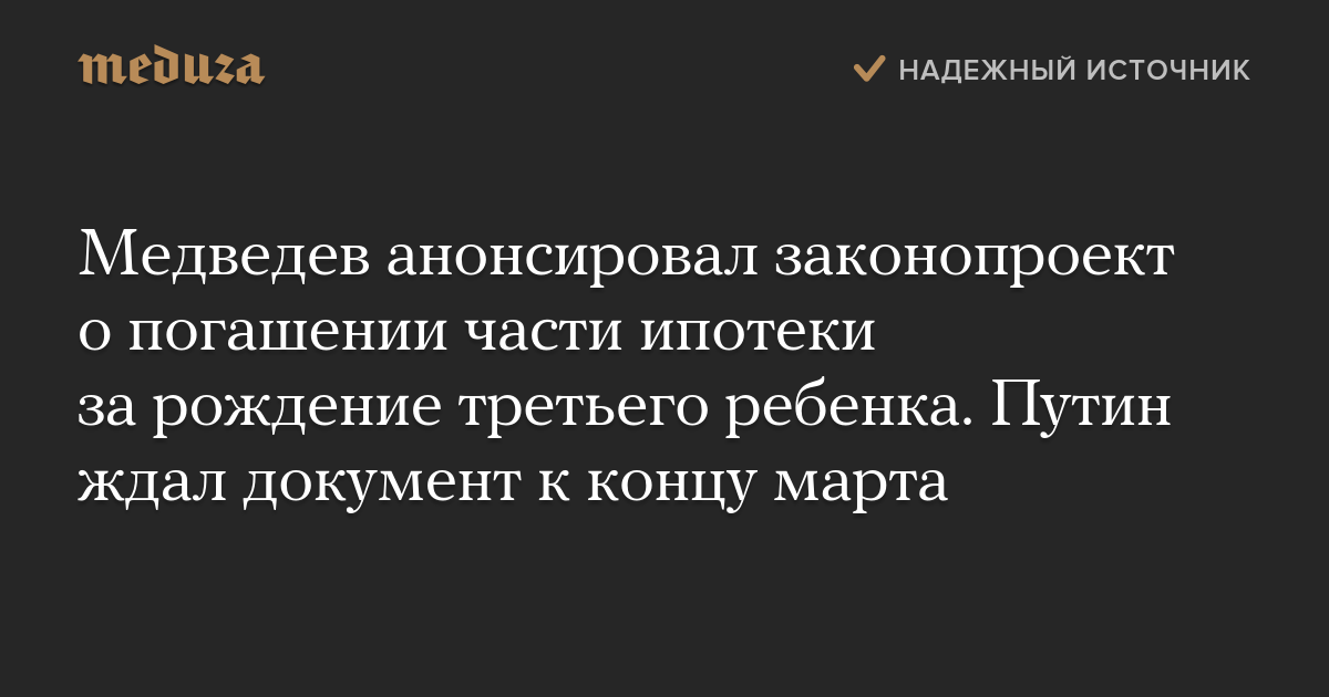 Медведев анонсировал законопроект о погашении части ипотеки за рождение третьего ребенка. Путин ждал документ к концу марта