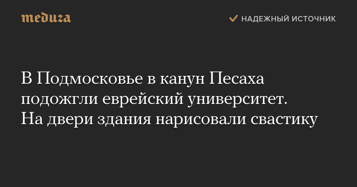 В Подмосковье в канун Песаха подожгли еврейский университет. На двери здания нарисовали свастику