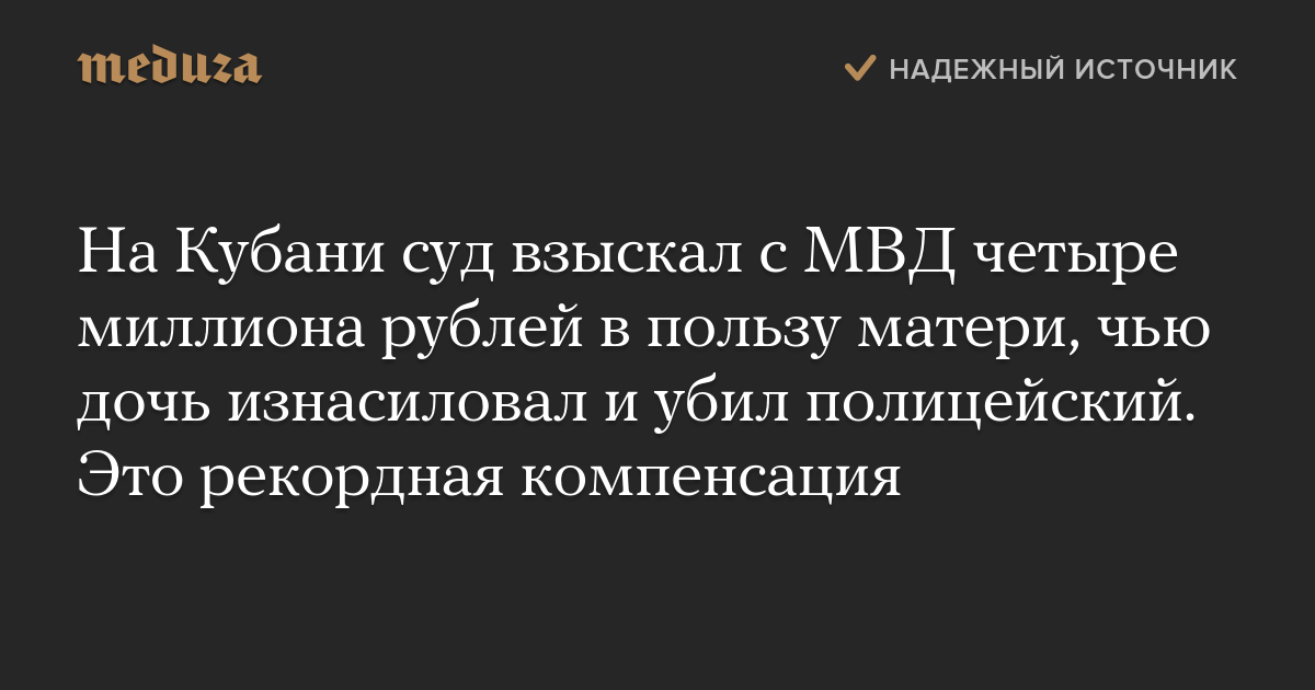На Кубани суд взыскал с МВД четыре миллиона рублей в пользу матери, чью дочь изнасиловал и убил полицейский. Это рекордная компенсация