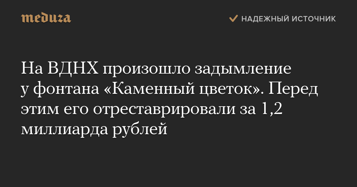 Обновление. Представитель ВДНХ сообщил «Медузе», что в коллекторе между фонтаном «Каменный цветок» и павильоном № 58 произошло задымление, которое быстро устранили. Возгорания, о котором ранее сообщалось в заметке, не произошло. На ВДНХ отметили, что фонтан не пострадал.