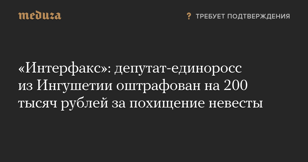 «Интерфакс»: депутат-единоросс из Ингушетии оштрафован на 200 тысяч рублей за похищение невесты