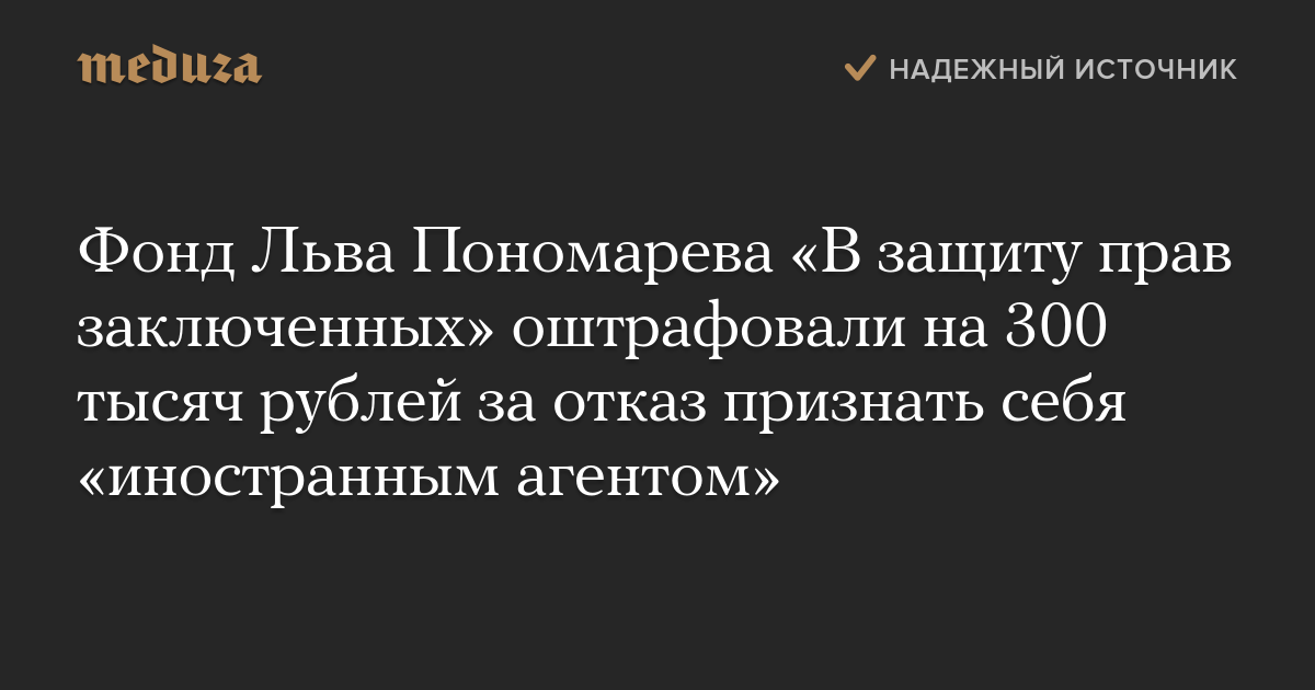 Фонд Льва Пономарева «В защиту прав заключенных» оштрафовали на 300 тысяч рублей за отказ признать себя «иностранным агентом»