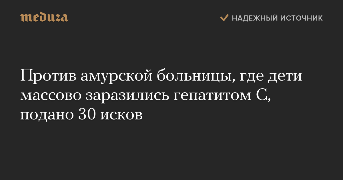 30 семей, чьи дети заразились гепатитом С, подали иски о возмещении моральной компенсации против Амурской областной детской клинической больницы в Благовещенске, сообщает «Коммерсант».