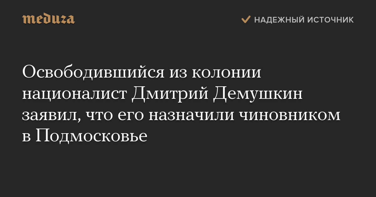 Националист Дмитрий Демушкин, в феврале освободившийся из колонии, подтвердил «Медиазоне», что назначен заместителем главы администрации сельского поселения Барвихинское в Подмосковье.