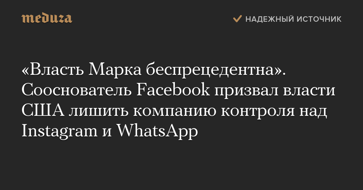 «Власть Марка беспрецедентна». Сооснователь Facebook призвал власти США лишить компанию контроля над Instagram и WhatsApp