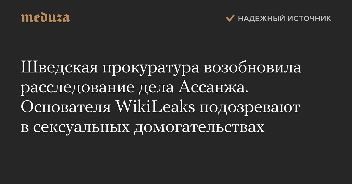 Прокуратура Швеции решила возобновить расследование уголовного дела в отношении основателя WikiLeaks Джулиана Ассанжа. Дело о сексуальных домогательствах, объявила прокурор Эва-Мария Перссон, возобновлено в связи с тем, что Ассанж задержан и появилась возможность требовать его экстрадиции.