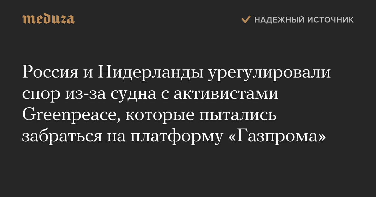 Россия и Нидерланды объявили об урегулировании спора из-за задержания в 2013 году судна «Арктик Санрайз» с активистами Greenpeace, которые пытались забраться на российскую нефтедобывающую платформу «Приразломная».