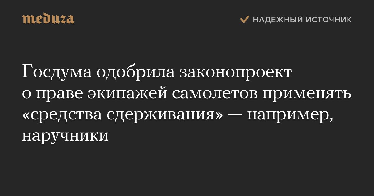 Госдума приняла в первом чтении законопроект, позволяющий членам экипажей самолетов применять «специальные средства сдерживания» к людям, подвергающим угрозе безопасность полета, а также жизнь и здоровье окружающих.
