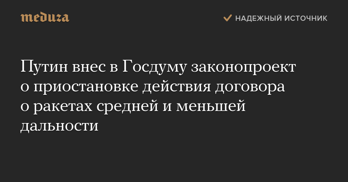 Путин внес в Госдуму законопроект о приостановке действия договора о ракетах средней и меньшей дальности