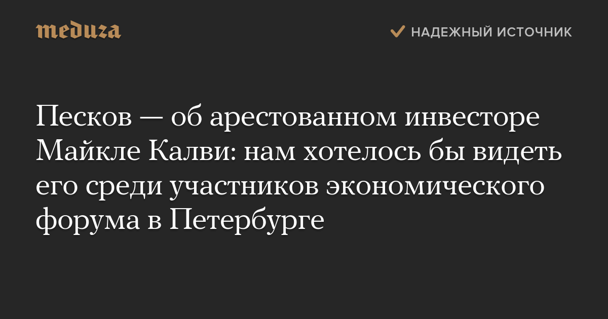 Пресс-секретарь президента РФ Дмитрий Песков заявил, что Кремлю «хотелось бы увидеть» среди участников Петербургского международного экономического форума инвестора Майкла Калви, который находится под домашним арестом.