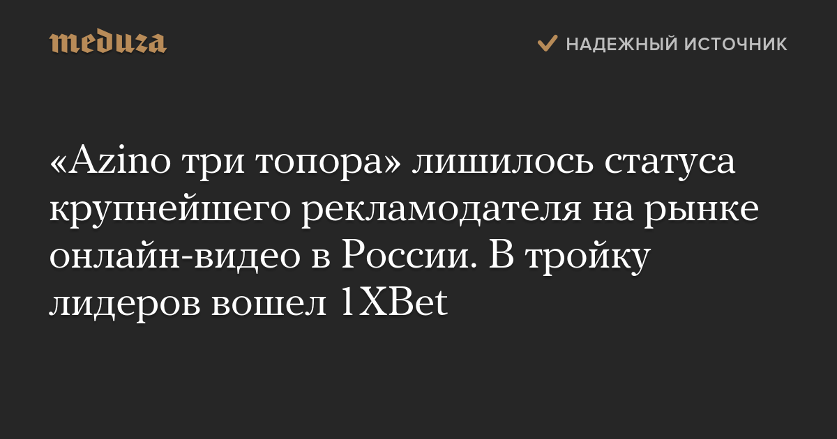 «Azino три топора» лишилось статуса крупнейшего рекламодателя на рынке онлайн-видео в России. В тройку лидеров вошел 1XBet