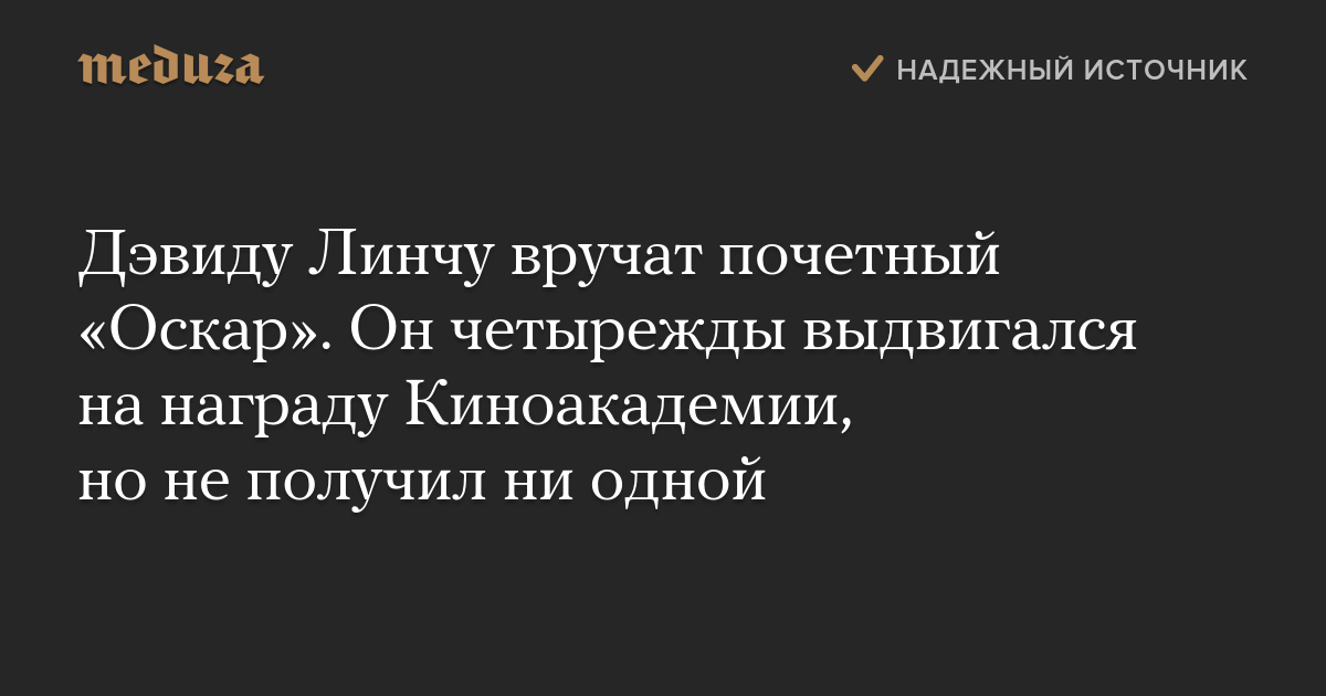 Почетный «Оскар» будет вручен Линчу на специальной церемонии 27 октября.
