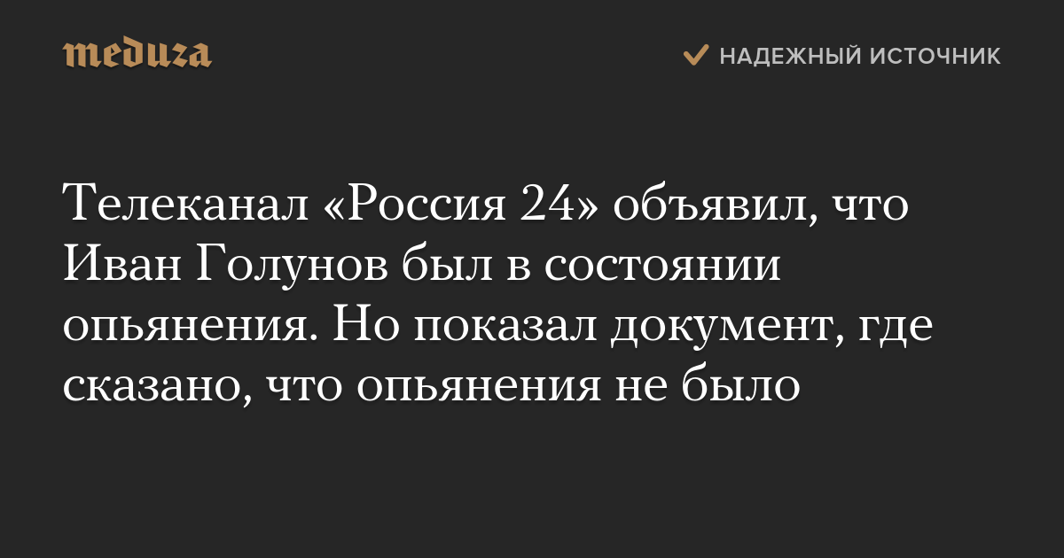 Днем 9 июня государственный телеканал «Россия 24» в сюжете об уголовном деле против корреспондента «Медузы» Ивана Голунова заявил, что тот в момент задержания 6 июня был в состоянии опьянения.