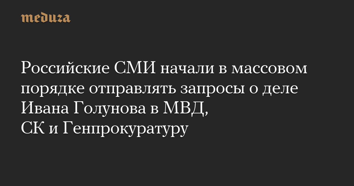 Редакции российских СМИ начали отправлять запросы, касающиеся уголовного преследования корреспондента «Медузы» Ивана Голунова, в ГУ МВД по Москве, МВД России, Следственный комитет и Генеральную прокуратуру. С запросами обращаются «Медиазона», «Новая Газета», «Эхо Москвы», «Дождь», The Bell, RTVI и «Сноб».