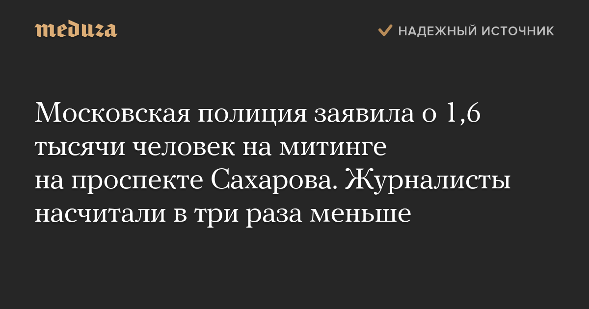 Что это за сообщение и почему оно повсюду на «Медузе»?На согласованной акции «Закон и справедливость для всех» на проспекте Сахарова в центре Москвы собрались около 1,6 тысячи человек. Об этом «Интерфаксу» заявили в главном управлении МВД по Москве.