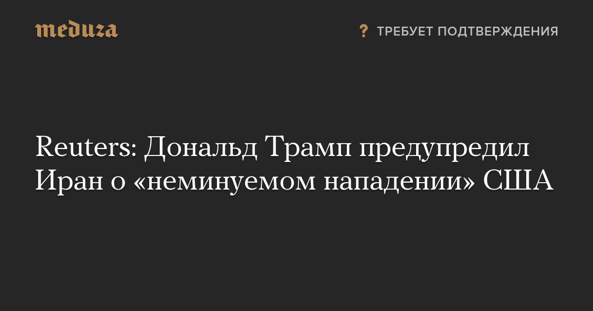 Президент США Дональд Трамп направил властям Ирана сообщение, предупреждающее о «неминуемом нападении» Соединенных Штатов. Как сообщили Reuters иранские чиновники, это сообщение было передано через представителей Омана.
