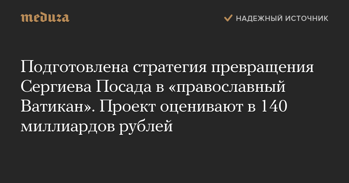 Газета «Ведомости» ознакомилась с 300-страничной стратегией развития Сергиева Посада, подготовленной консалтинговым бюро «Стрелка» в рамках инициативы превращения города в «столицу православия» или «православный Ватикан».