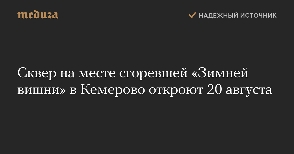 Сквер на месте торгового центра «Зимняя вишня» в Кемерово, сгоревшего в марте 2018 года, откроют 20 августа, сообщил в фейсбуке губернатор Кемеровской области Сергей Цивилев.