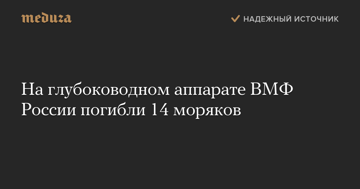 14 моряков-подводников ВМФ России погибли в результате пожара на научно-исследовательском глубоководном аппарате, сообщает «Интерфакс» со ссылкой на Минобороны. Моряки погибли из-за отравления продуктами горения. Имена погибших пока не сообщаются.