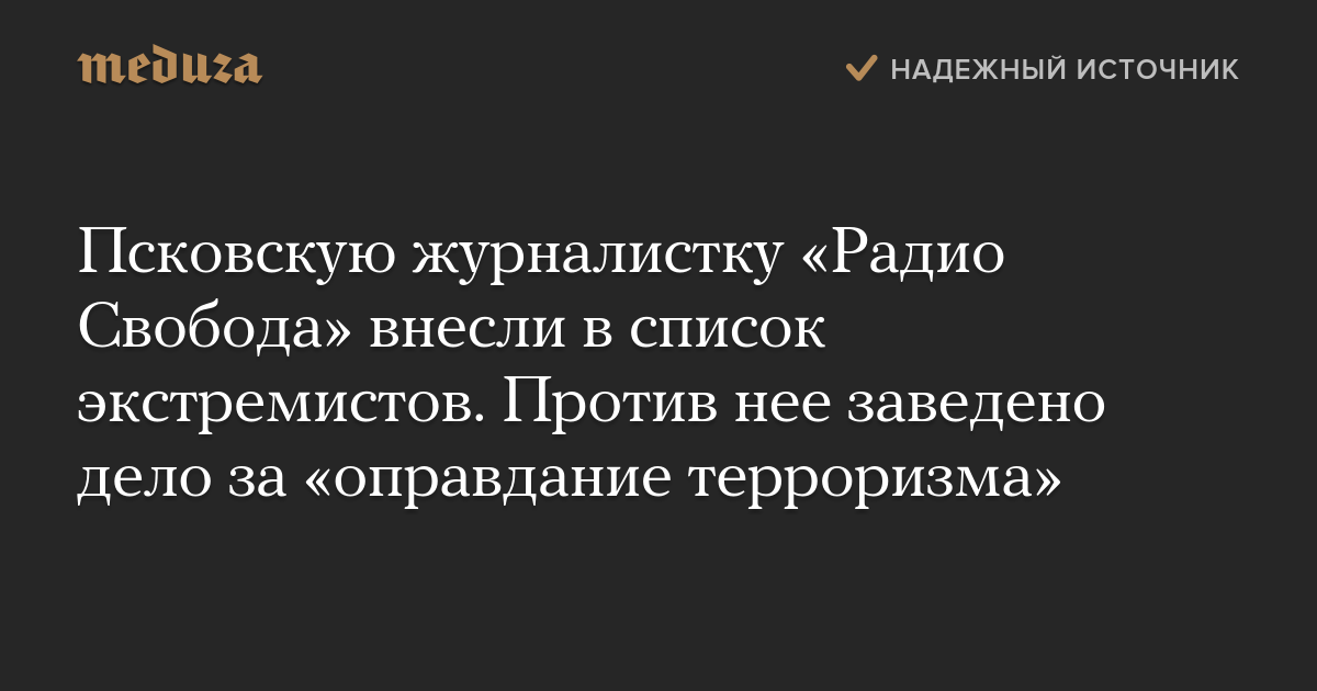 Псковскую журналистку «Радио Свобода» внесли в список экстремистов. Против нее заведено дело за «оправдание терроризма»