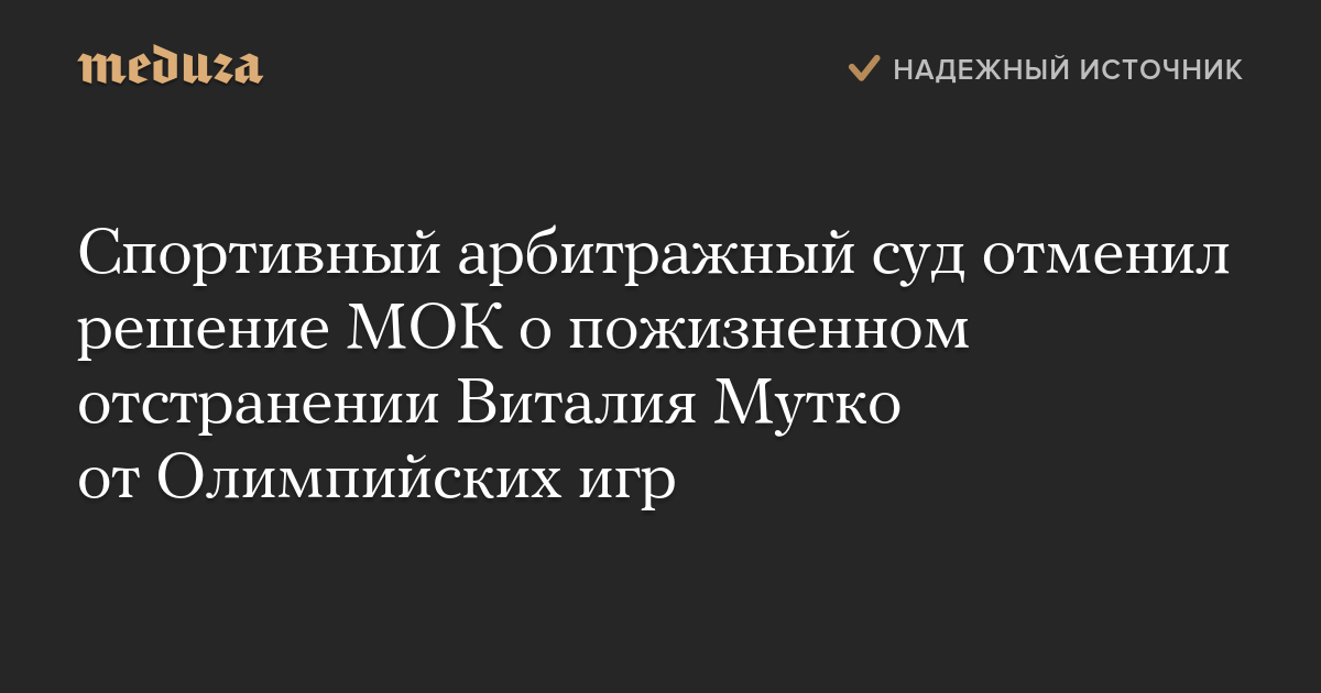 Спортивный арбитражный суд в Лозанне (CAS) отменил решение Международного олимпийского комитета (МОК) о пожизненном отстранении от Олимпийских игр вице-премьера РФ, бывшего министра спорта Виталия Мутко.