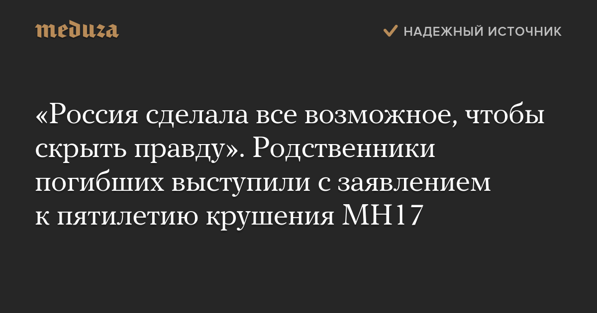 «Новая газета» опубликовала заявление родственников людей, погибших пять лет назад при крушении малайзийского «боинга» под Донецком. В тексте они призвали российские власти признать «свою часть» ответственности за случившееся и «прекратить лицемерно отпираться, сеять ложь и обман».