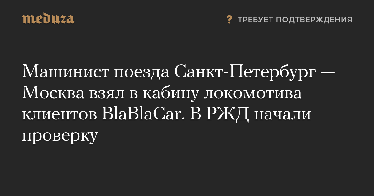 О том, что машинист поезда возит в кабине локомотива клиентов BlaBlaCar, сообщало издание Baza. Со слов пассажира, он нашел через сервис предложение доехать из Петербурга в Москву за 1300 рублей, при этом водитель уточнил, важно ли ему, на каком типе транспорта ехать. Встреча была назначена на перроне Московского вокзала — там пассажир и узнал, что он общался с машинистом, и ему предстоит ехать в кабине локомотива. Вместе с ним там ехал еще один клиент BlaBlaCar.