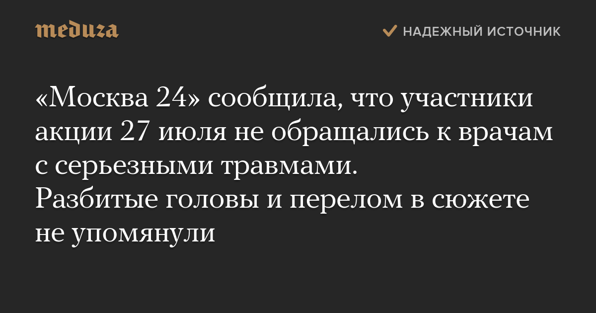 Телеканал «Москва 24» в новостном сюжете о протестах в Москве сообщил, что участники акции 27 июля не обращались к врачам с серьезными травмами.