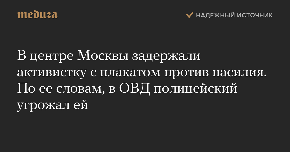 В центре Москвы задержали активистку с плакатом против насилия. По ее словам, в ОВД полицейский угрожал ей