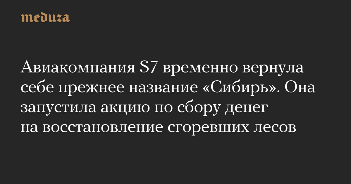 S7 Airlines, крупнейшая частная авиакомпания России, решила временно вернуть свое историческое название «Сибирь» ради инициативы по восполнению лесов, сгоревших в Сибири. Об этом говорится в заявлении авиакомпании, поступившем в редакцию «Медузы».