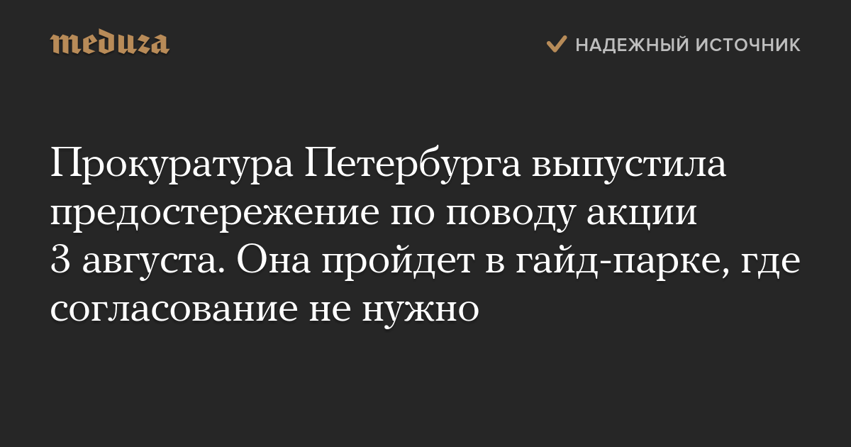 Прокуратура Петербурга выпустила предостережение по поводу акции 3 августа. Она пройдет в гайд-парке, где согласование не нужно