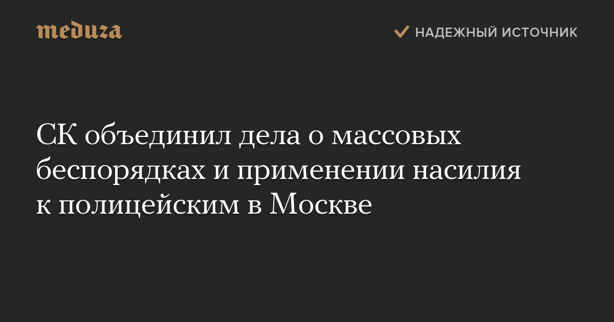 Следственный комитет объединил в одно дело дела о массовых беспорядках и применении насилия к представителям власти, возбужденные после московского митинга 27 июля. Копию соответствующего постановления от 30 июля опубликовал глава «Агоры» Павел Чиков.