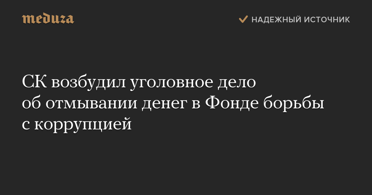 Что это за сообщение и почему оно повсюду на «Медузе»?Следственный комитет возбудил уголовное дело об отмывании порядка миллиарда рублей в Фонде борьбы с коррупцией Алексея Навального.
